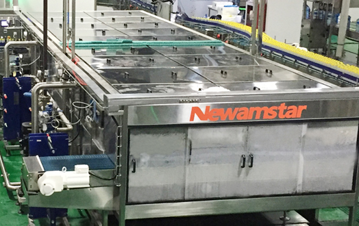 由于碳酸飲料采用低溫灌裝(常用4-10℃),而夏季的室溫遠(yuǎn)高于此,在這樣的環(huán)境中 ,空氣中的水分極易在瓶身外表面冷凝結(jié)露,給后續(xù)包裝和操作帶來不便,如貼標(biāo)。特別是如果采用紙箱包裝,則露水浸濕紙板,可造成嚴(yán)重破損。所以在灌裝機后必須設(shè)置一臺溫瓶機,對瓶身加熱至室溫。溫瓶機是一臺隧道式噴淋設(shè)備,通過循環(huán)噴淋熱水的熱交換方式加熱瓶身,常設(shè)三個溫區(qū)(也可設(shè)計更多的溫區(qū))。分段加熱后,飲料中心的溫度達(dá)到室溫。溫瓶機的進(jìn)出口采用動態(tài)過渡,減少擠壓倒瓶及人工干預(yù)。