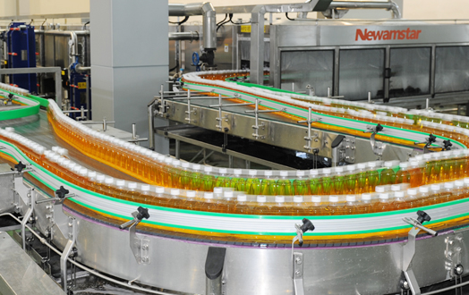 噴淋殺菌機采用熱水噴淋殺菌和逐步降溫冷卻的五段式處理。設備配置有自動加氯泵,可根據補水量調節(jié)加氯量。熱水由蒸汽加熱裝置產生,使用后的水流入機架水槽,由噴淋泵循環(huán)使用。若熱水溫度達不到設定溫度,由加熱裝置再對其適當加溫。若熱水溫度超過設定溫度,則由循環(huán)泵送至車間外的冷卻塔冷卻后再循環(huán)使用。噴淋殺菌機的進出口采用動態(tài)過渡,減少擠壓倒瓶及人工干預。
